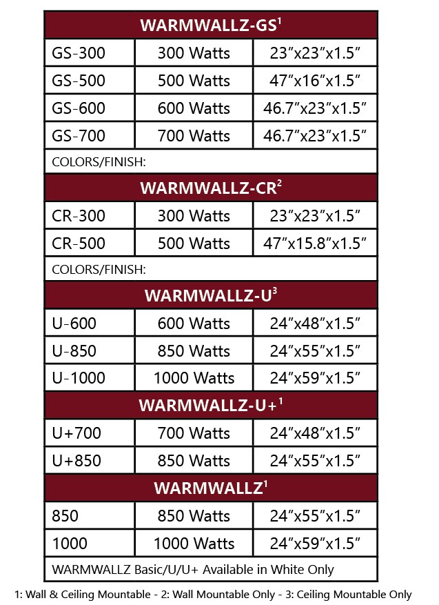 WarmWallz offers varying models for heating either/or ceiling and walls. With varying heat output, sizes, and finishes, there is a WarmWallz perfect for your application and situation. Explore the differences between the WarmWallz lines: